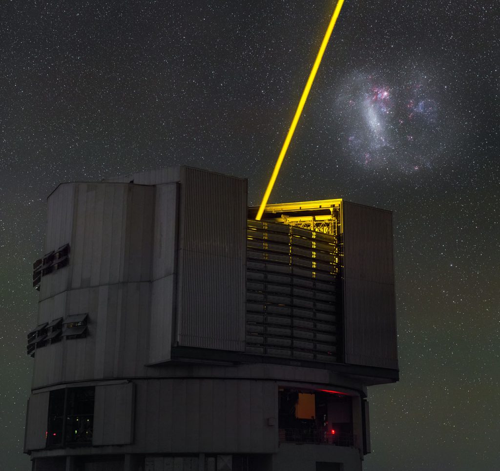 El láser que se muestra en esta imagen actúa como una estrella artificial, conocido como una estrella de guía láser, y se utiliza para ayudar a los astrónomos a ajustar los efectos de desenfoque y distorsión generados por la atmósfera de la Tierra. Al observar una zona del cielo, los astrónomos generan una estrella guía láser cercana y miden las pequeñas variaciones de su imagen. El sistema de óptica adaptativa del VLT utiliza esta referencia para corregir los cambios y distorsiones que tienen lugar en la atmósfera y producir imágenes lo más nítidas posible en las observaciones principales.