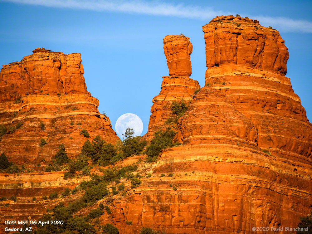 Imagen de la salida de la Luna captada la tarde del lunes, 6 de abril de 2020, desde Sedona en el estado de Arizona, Estados Unidos. La captura fue obtenida a las 18:22 (hora local) con una cámara Nikon D750; tiene 100 de ISO, f/8 de apertura y un tiempo de exposición de 1/320 de segundo.