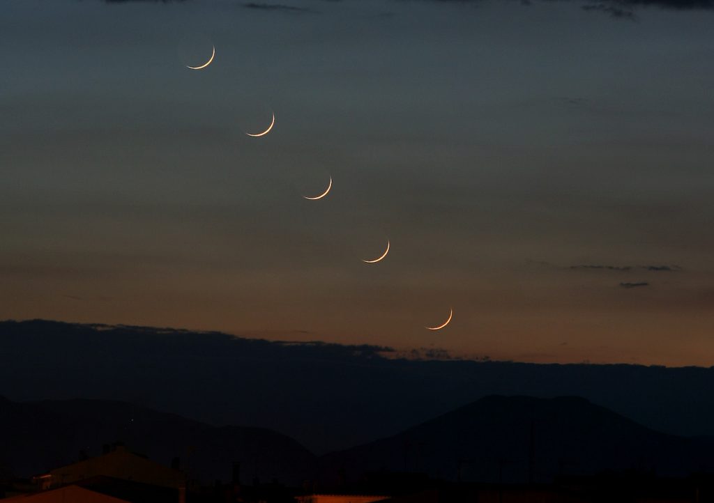 Imagen de la secuencia de la puesta de la Luna creciente captada el viernes, 24 de abril de 2020, desde Cassà de la Selva, Girona, España. Las capturas fueron obtenidas con una cámara Canon EOS 350D; cada una tiene un tiempo de exposición de 1 segundo, f/4 de apertura y 200 de ISO.