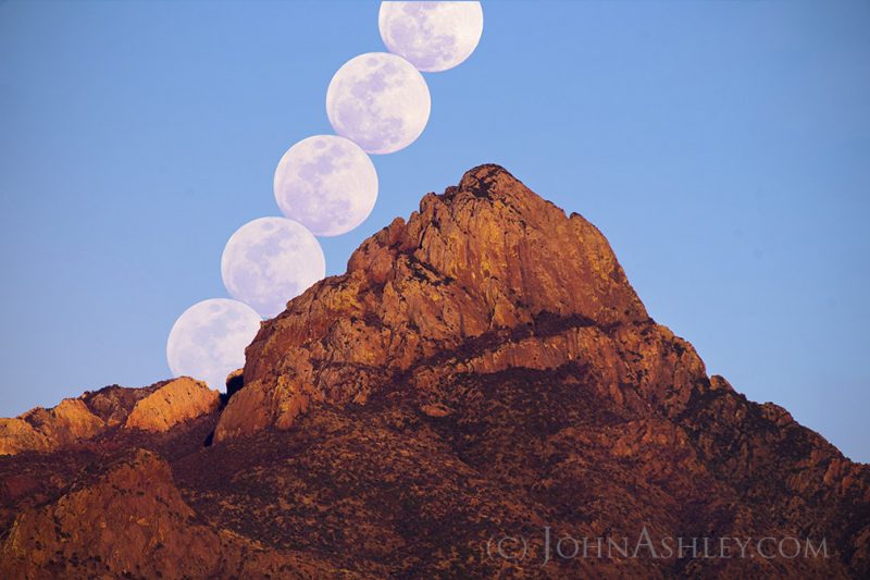 Imagen que muestra la secuencia de la salida de la Luna detrás del Baboquivari Peak el domingo, 21 de febrero de 2016. Fue tomada desde Topowa, al sur del Estado de Arizona (Estados Unidos). La imagen está compuesta por cinco fotografías de 400 de ISO y 1/1000 segundos de exposición cada una. Se utilizó una cámara Nikon D750.