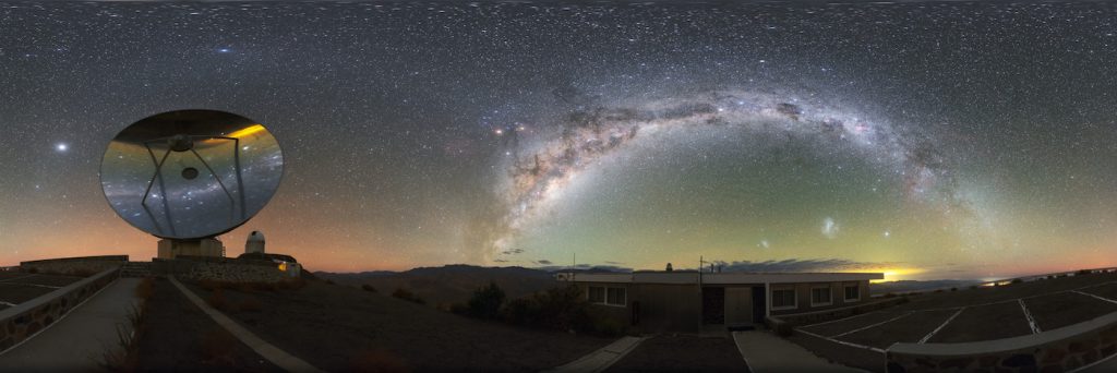 En la zona derecha de esta imagen panorámica se puede ver la Vía Láctea y las Nubes de Magallanes cerca del horizonte. En la zona izquierda se puede ver el SEST (Telescopio Sueco Submilimétrico). La imagen se tomó desde el cerro La Silla en Chile.