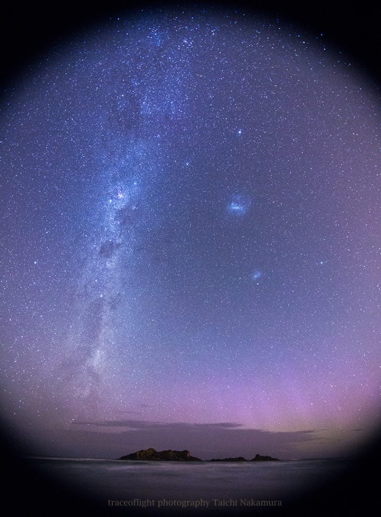 Impresionante imagen de la Vía Láctea tomada el viernes, 27 de enero de 2017, desde Dunedin en la isla sur de Nueva Zelanda. Del lado derecho de la Vía Láctea se pueden ver la Pequeña y la Gran Nube de Magallanes (galaxias satélite de la Vía Láctea). La imagen tiene 20 segundos de exposición y 12000 de ISO; se utilizó una cámara Sony ILCE-7S.