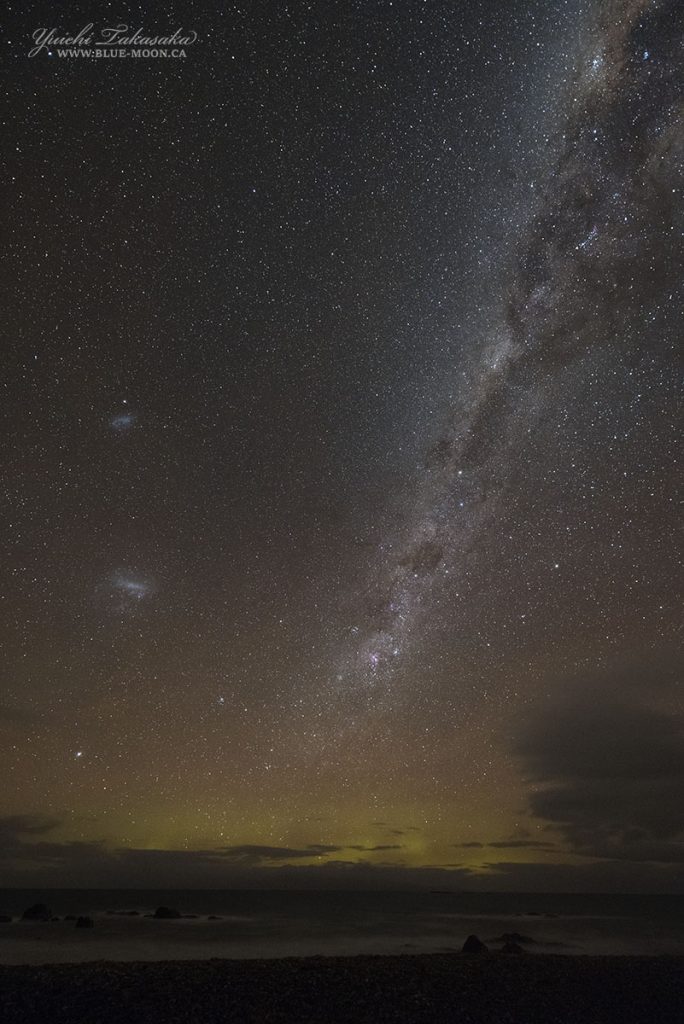 Imagen de la Vía Láctea tomada la noche del domingo, 4 de junio de 2017, desde Riverton (Southland, Nueva Zelanda). En la región izquierda se pueden ver la Nubes de Magallanes (galaxias satélite de la Vía Láctea). La captura se obtuvo con una cámara Nikon D810A; tiene 20 segundos de tiempo de exposición y 6400 de ISO.
