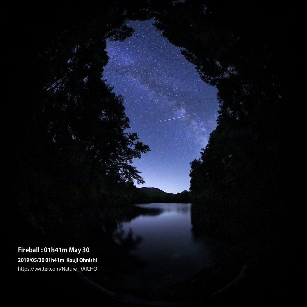 Excelente imagen de un meteoro cruzando la Vía Láctea la madrugada del jueves, 30 de mayo de 2019. Fue tomada a las 01:41 (hora local) desde Otari en Nagano, Japón. La imagen está compuesta por 3 capturas de 20 segundos de tiempo de exposición y 8000 de ISO cada una. Se utilizó una cámara Canon EOS 5D Mark IV.