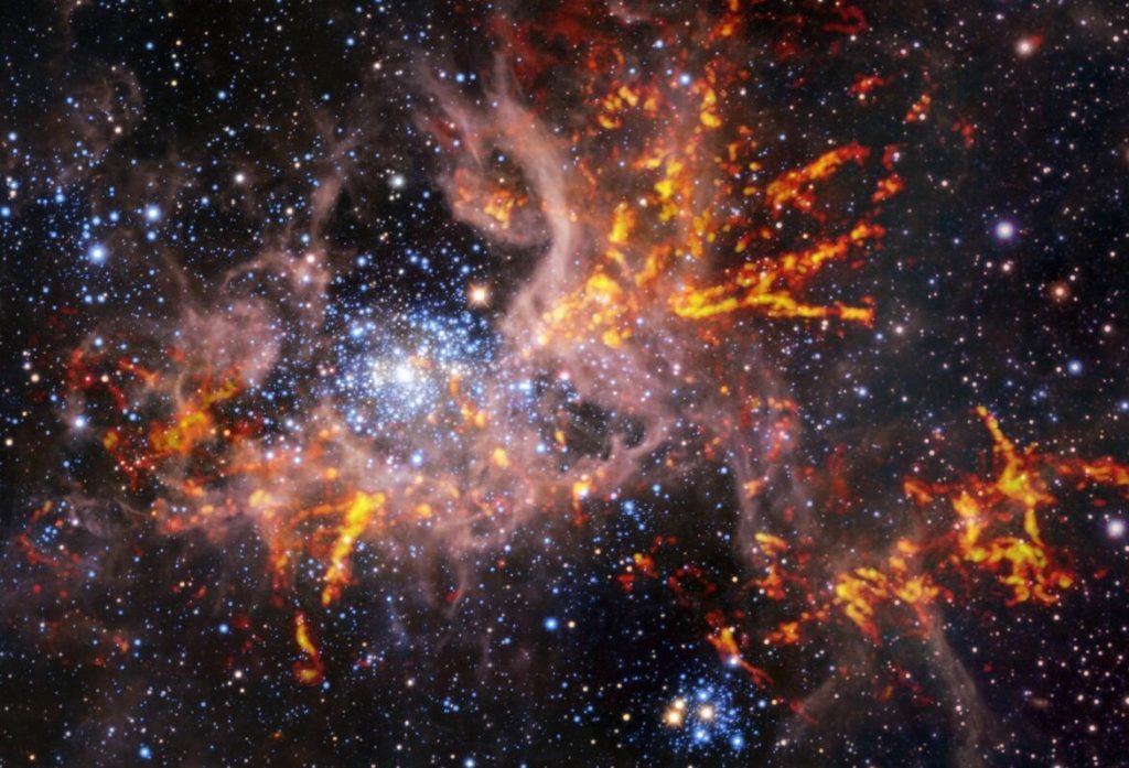 En la imagen publicada hoy por ESO, vemos los nuevos datos de ALMA superpuestos en una imagen infrarroja anterior de la misma región que muestra estrellas brillantes y claras nubes rosadas de gas caliente, tomadas con el Very Large Telescope (VLT) de ESO y el Visible and Infrared Survey Telescope for Astronomy (VISTA) de ESO. La composición muestra la distintiva forma de tela o de red de las nubes de gas de la nebulosa de la Tarántula, lo cual dio lugar a su nombre de araña. Los nuevos datos de ALMA comprenden los brillantes rastros rojos y amarillos de la imagen: gas muy frío y denso que algún día podría colapsar y formar estrellas.