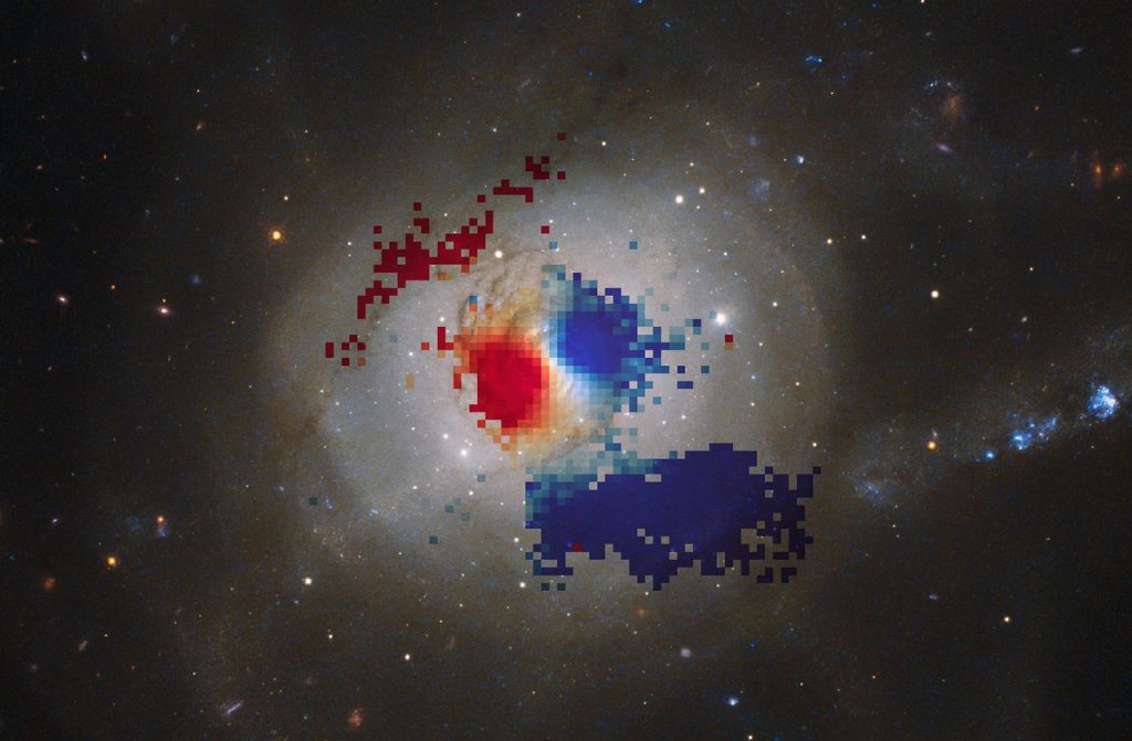 Las regiones en rojo indican el gas que se aleja de nosotros y, las regiones en azul, el que se acerca hacia nosotros. Juntos, estos colores muestran el centro de la galaxia girando constantemente y destacan dos flujos de gas caliente hacia el noroeste y el sudeste de la región central. Estudios anteriores sugirieron que la espiral central giraba al contrario que el resto de la galaxia, pero al comparar el movimiento de las estrellas que hay alrededor de la galaxia con el gas ionizado por las estrellas recién formadas en la miniespiral, ahora sabemos que, de hecho, están girando en la misma dirección.