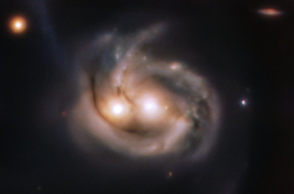 Este objeto de aspecto curioso es el resultado de dos galaxias fusionándose entre sí, con una sonrisa arremolinada y un par de ojos que esconden dos crecientes agujeros negros supermasivos. Este tipo de fusiones son algo poco común en nuestro barrio galáctico y Mrk 739 está lo suficientemente cerca, astronómicamente hablando, como para estudiar el evento en detalle y así obtener una mejor comprensión de los impactantes procesos que tienen lugar durante estas fusiones cósmicas.