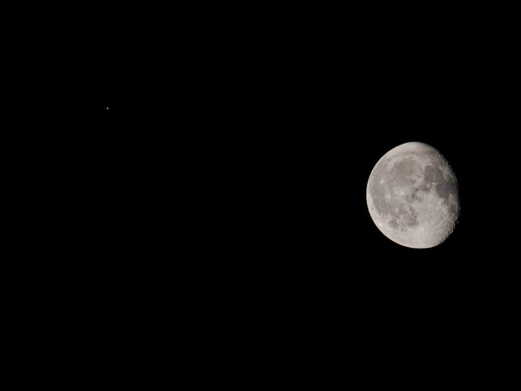 Estas fotografías fueron tomadas durante la madrugada y mañana del domingo, 6 de septiembre de 2020, desde la ciudad de Zaragoza, España. Se puede apreciar la conjunción de la Luna gibosa menguante y Marte. El planeta es visible incluso en las fotos de día.