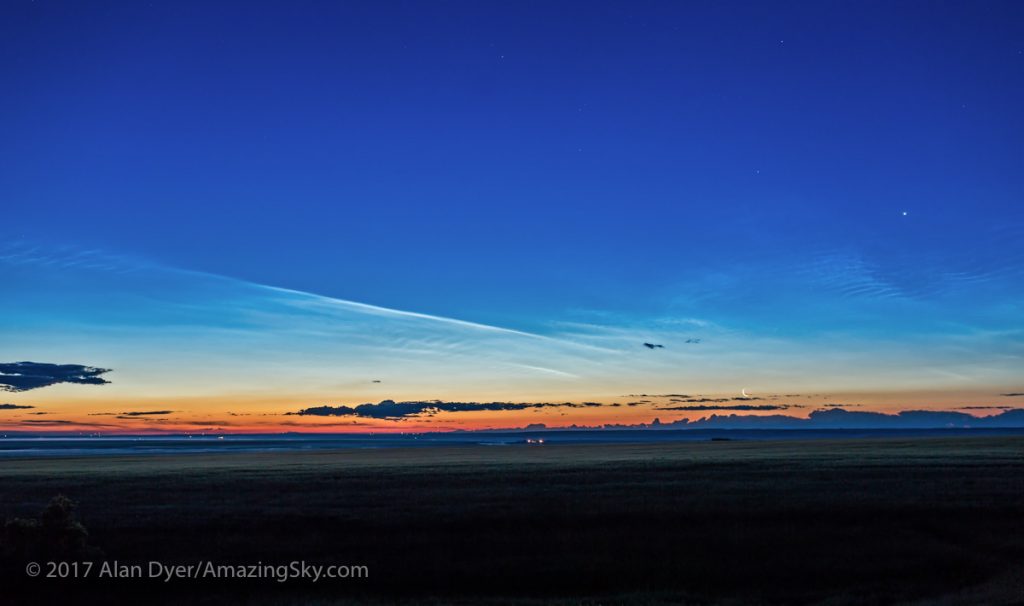 Imagen de nubes noctilucentes tomada al amanecer del viernes, 21 de julio de 2017, desde la provincia de Alberta en Canadá. En la zona inferior-derecha, justo arriba del horizonte, se puede ver a la Luna menguante; Venus está ubicado en la zona superior-derecha. La captura se obtuvo con una cámara Canon EOS 6D y un objetivo Canon (35mm). Tiene un tiempo de exposición de 1,3 segundos y 400 de ISO.