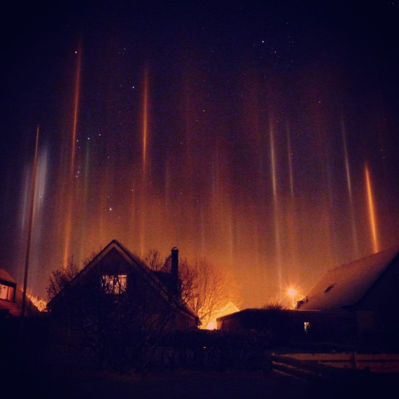 Estupenda captura de pilares de luz sobre la ciudad de Karlstad, Suecia. En la izquierda de la imagen se puede ver a la constelación de Orión; en la zona superior-derecha se encuentra la constelación de Tauro. La foto fue tomada con una cámara Panasonic DMC-FZ28; el tiempo de exposición es de 10 segundos y 800 de ISO.