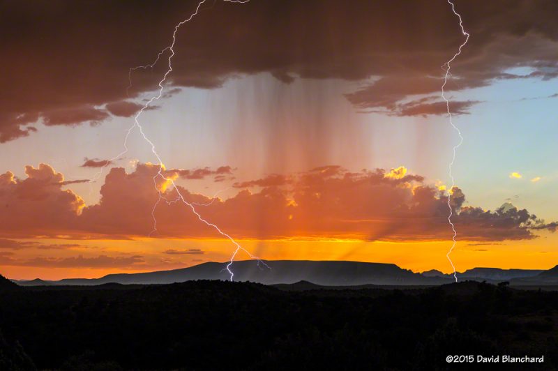 Impresionante e inusual imagen de una tormenta eléctrica al atardecer en Sedona, Arizona, Estados Unidos. Fue tomada el 15 de agosto de 2015. No es común observar fotografías de una tormenta eléctrica en combinación con un atardecer tan colorido y con un cielo parcialmente despejado. Se utilizó una cámara Nikon D700.