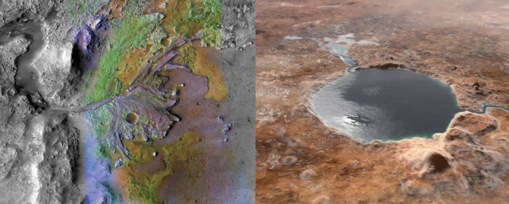 En el cráter Jezero, de unos 50 km de diámetro y situado en la zona ecuatorial de Marte. Los científicos piensan que hace millones de años estaba inundado de agua: era un lago donde desembocaba un río. Este transportaba compuestos arcillosos que tienden a atrapar y preservar la materia orgánica, por lo que el delta es un buen lugar para encontrar restos de vida marciana si es que la hubo.