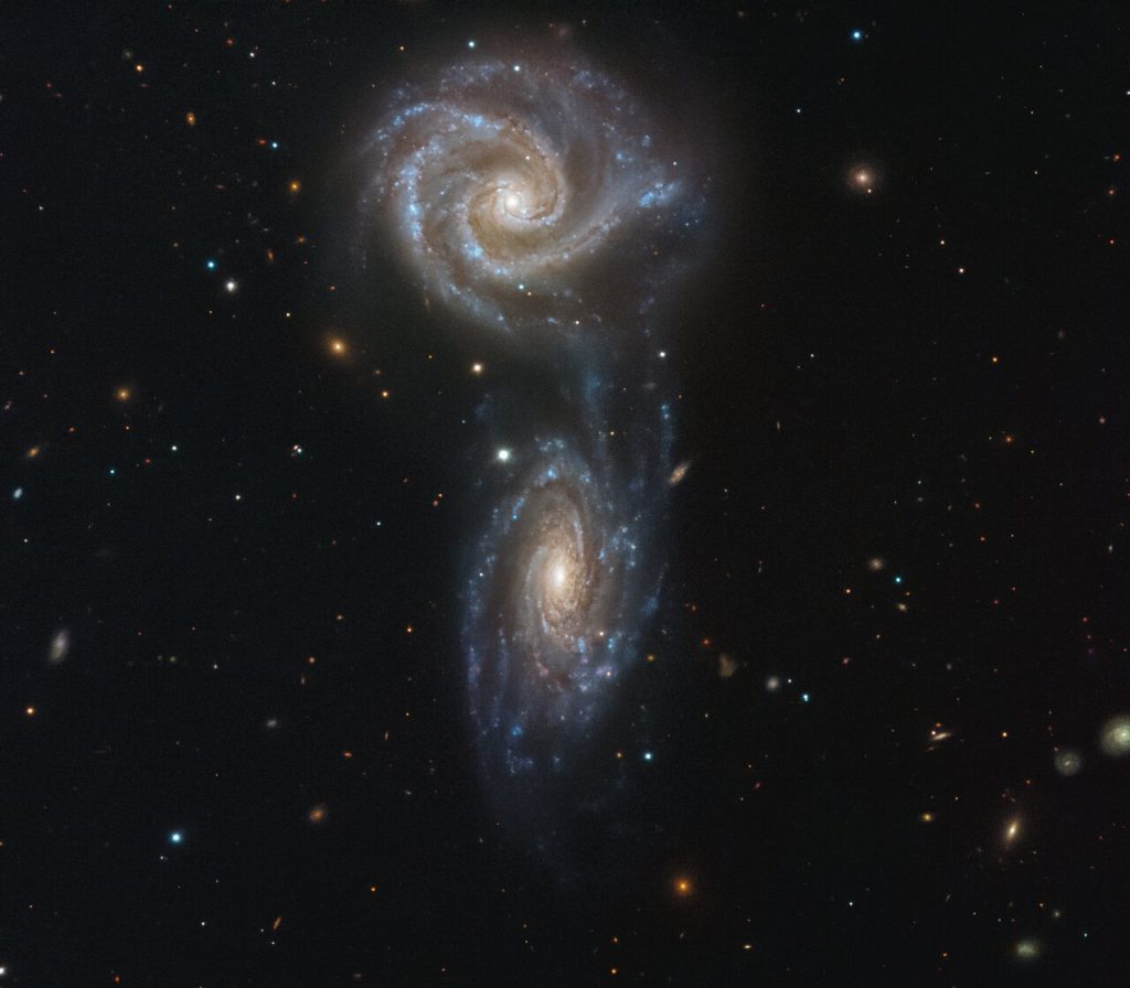 Esta imagen muestra un par de galaxias en interacción conocidas como Arp 271. Individualmente, estas galaxias se denominan NGC 5426 y NGC 5427; ambas son espirales, y ambas tienen aproximadamente el mismo tamaño.