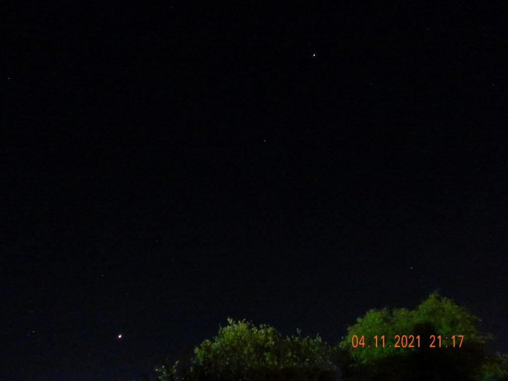 Fotografía tomada la noche del 4 de noviembre de 2021, desde la ciudad de Tacuarembó en el Departamento de Tacuarembó, Uruguay. Venus es visible en la zona inferior-izquierda; Saturno se encuentra cerca del centro de la imagen y Júpiter en la zona superior-derecha.