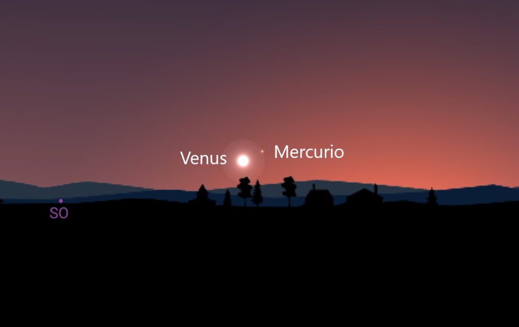 Venus y Mercurio alcanzarán su aproximación máxima al anochecer de este jueves, 29 de diciembre de 2022. Los dos planetas estarán ubicados cerca del horizonte en dirección Suroeste, por lo que se recomienda observar desde lugares donde no existan objetos que obstruyan la vista, tales como montañas o edificios. Venus estará brillando con una magnitud de -3,9 y Mercurio de +0,4.