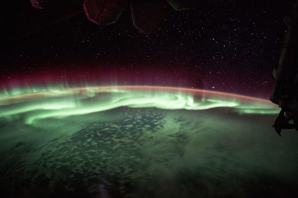 Esta imagen fue captada desde la Estación Espacial Internacional el 25 de junio de 2017 a las 12:08 UTC. Se pueden ver varias líneas de auroras australes brillando sobre el Océano Antártico. Al momento de tomarse la imagen, la Estación Espacial Internacional se encontraba ubicada al oeste de las islas Auckland (Nueva Zelanda).